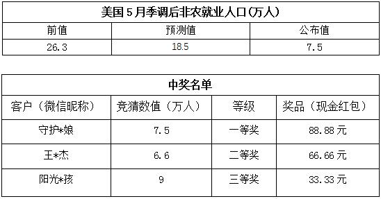 “5月份非农就业人数大竞猜”活动的中奖结果已出,获奖信息如下: